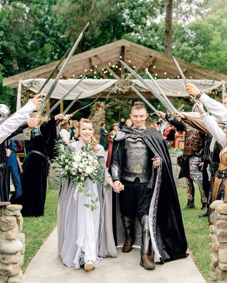 Châteaux, chevaliers, repas festif, costumes d’époque, cérémonies inspirées : l’ambiance transporte le couple et les convives dans un autre temps.